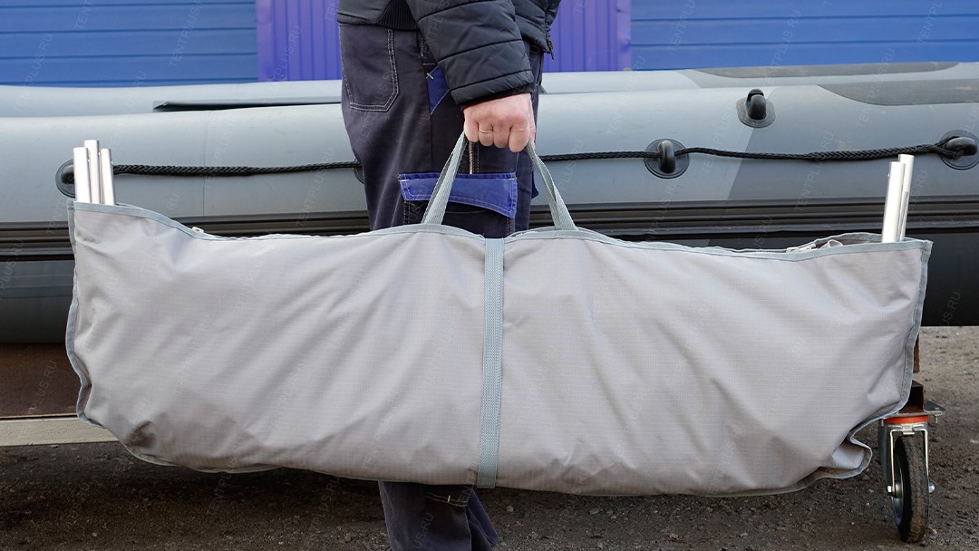 Базовая комплектация тентов-трансформер для ПВХ лодок: комплект дуг, лобовое окно на молниях для выхода из лодки на берег, задний клапан на двух молниях для доступа к мотору, прозрачные два боковых окна и на заднем клапане, боковые молнии для трансформации тента в тент-крыша, стропа-фиксатор для крепления боковин при открытом переднем клапане, крепление, сумка для хранения и переноски тента.