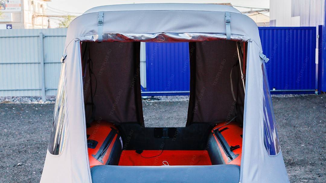 Базовая комплектация тентов-трансформер для ПВХ лодок: комплект дуг, лобовое окно на молниях для выхода из лодки на берег, задний клапан на двух молниях для доступа к мотору, прозрачные два боковых окна и на заднем клапане, боковые молнии для трансформации тента в тент-крыша, стропа-фиксатор для крепления боковин при открытом переднем клапане, крепление, сумка для хранения и переноски тента.