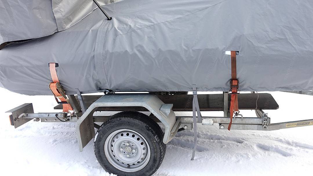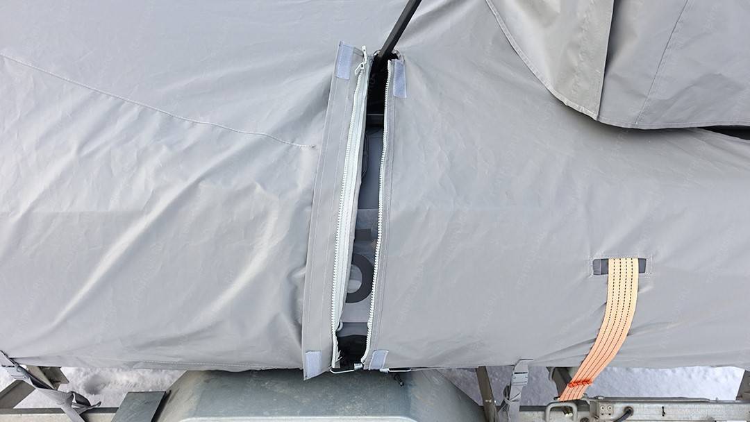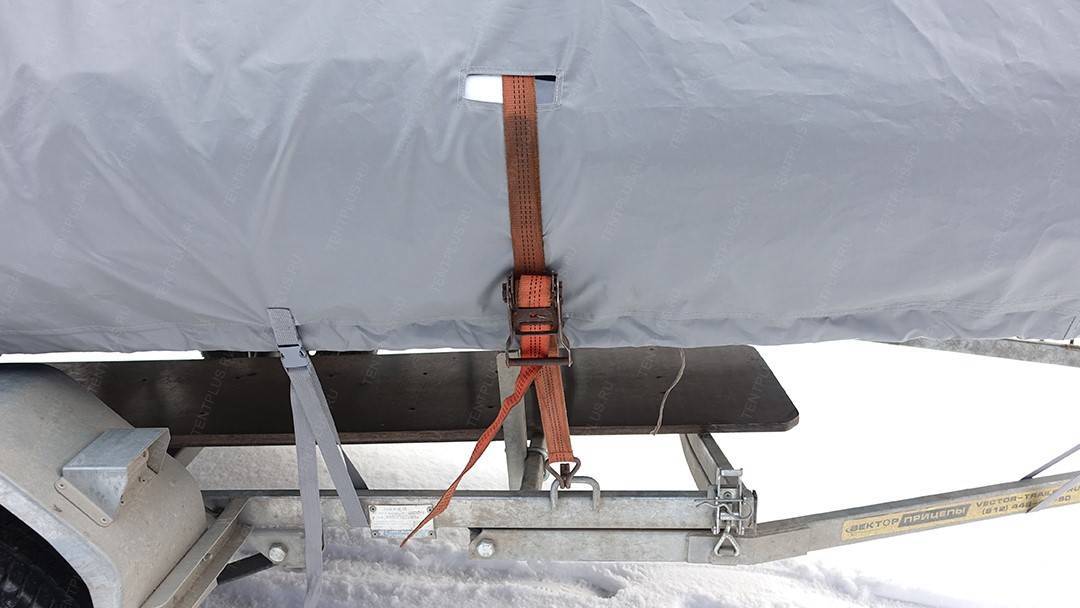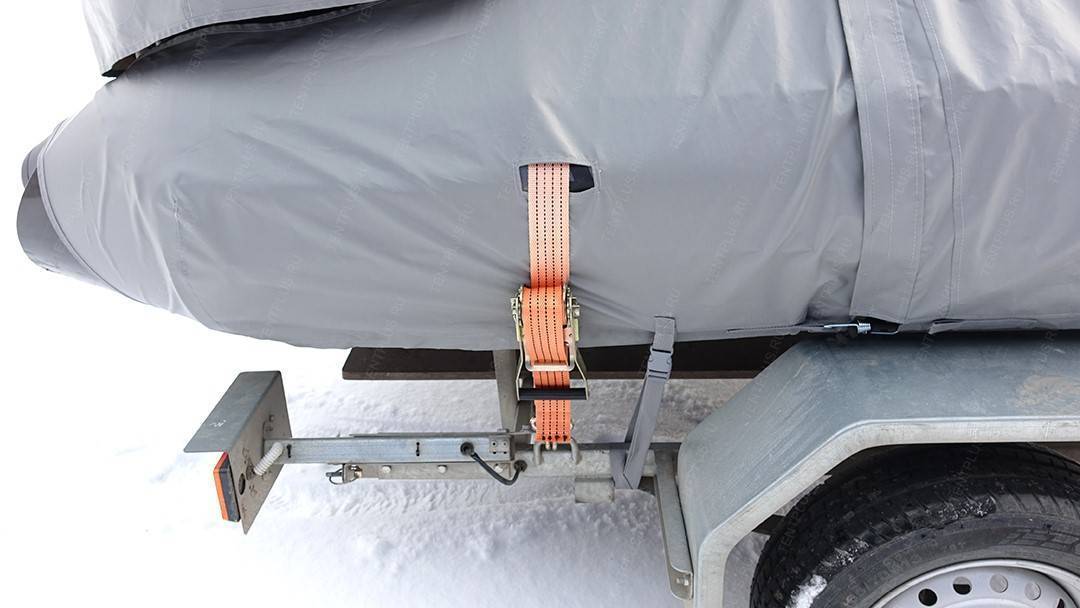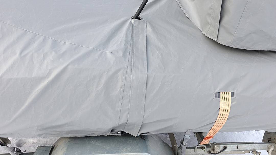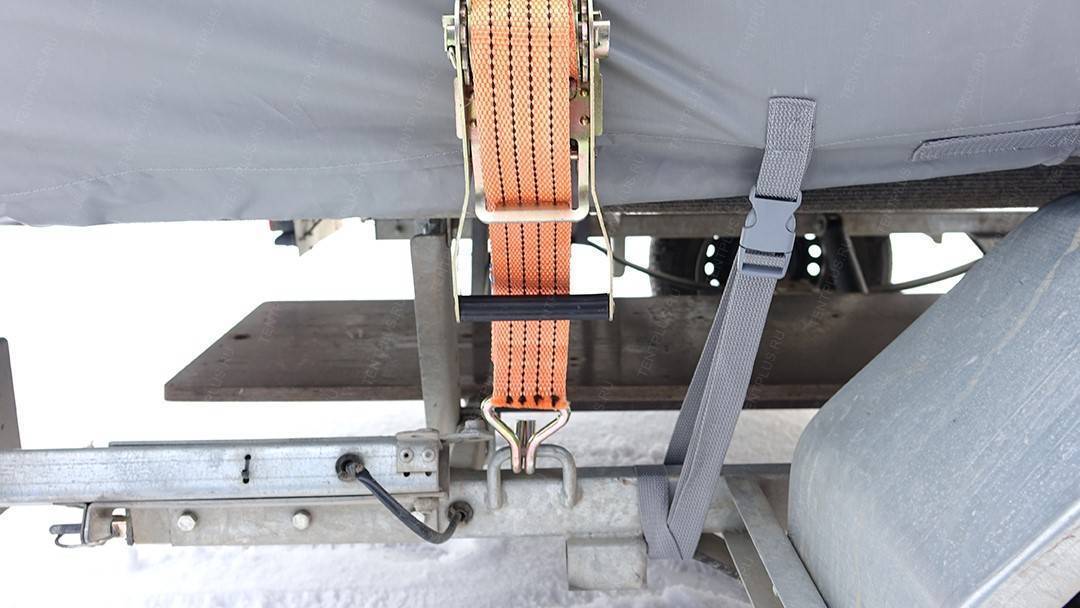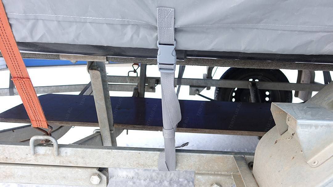По периметру пришиты усиленные паты с пряжками, в которые вставляется ременная лента для притягивания тента к прицепу .