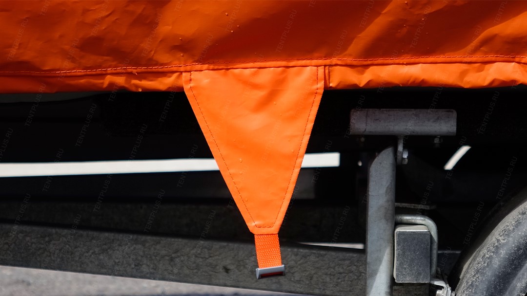 По периметру пришиты усиленные паты с пряжками, в которые вставляется ременная лента для притягивания тента к прицепу.