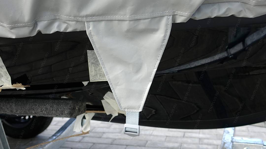 По периметру пришиты усиленные паты с пряжками, в которые вставляется ременная лента для притягивания тента к прицепу.