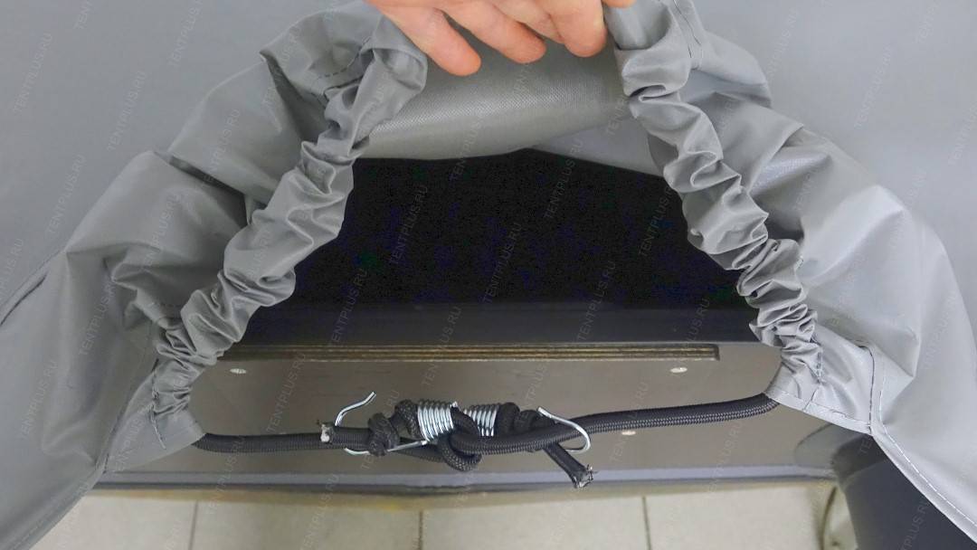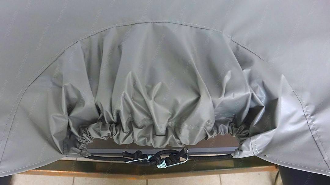 На фото представлен тент из ПВХ ткани плотностью 300 гр/м2 . По низу тента вшит эспандер (круглая резинка диаметром 8 мм) для утяжки низа тента.