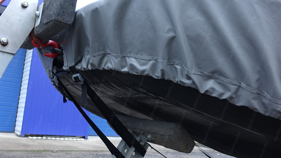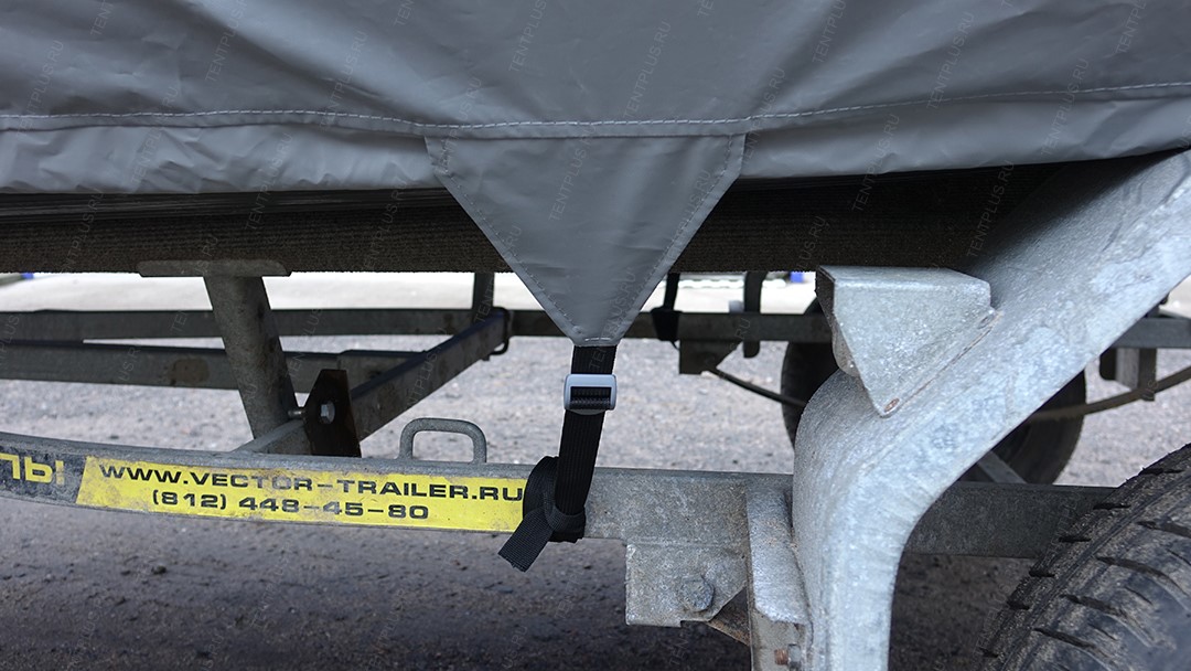 По периметру пришиты усиленные паты с пряжками, в которые вставляется ременная лента для притягивания тента к прицепу.