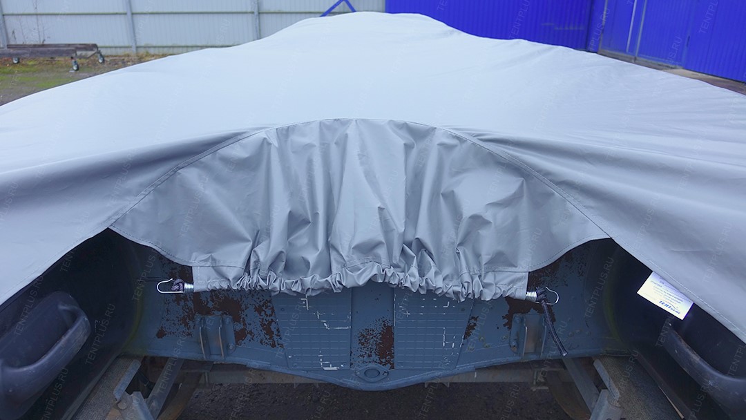 На фото представлен тент из ПВХ ткани плотностью 300 гр/м2 . По низу тента вшит эспандер (круглая резинка диаметром 8 мм) для утяжки низа тента.