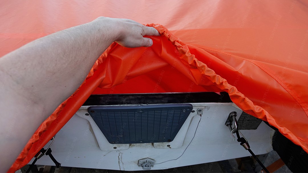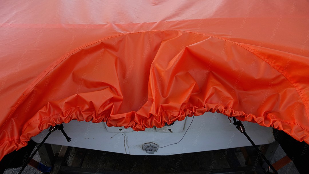 - На фото представлен тент из ПВХ ткани плотностью 300 гр/м2 . По низу тента вшит эспандер (круглая резинка диаметром 8 мм) для утяжки низа тента.