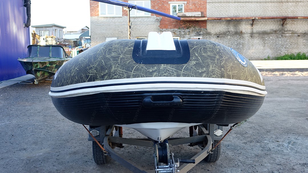 - Тент из ПВХ ткани на лодку Штормлайн РИБ 400 легко моется, не выгорает, выдерживает ветровые нагрузки при транспортировке.